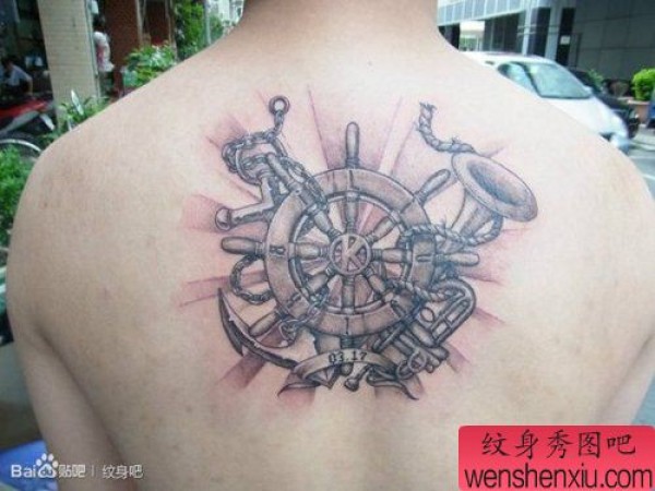 后背经典的黑灰船舵纹身图案