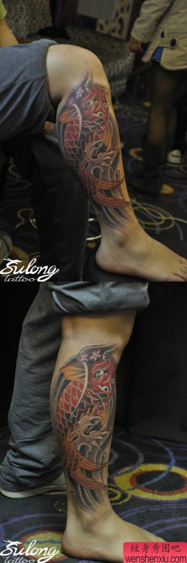 男士腿部经典的传统鲤鱼纹身图案