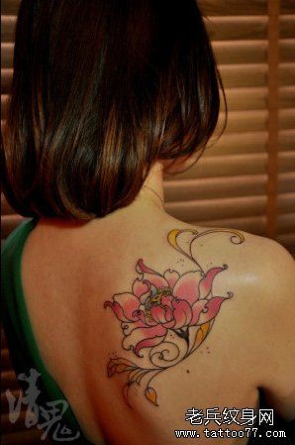 美女肩膀漂亮的粉色莲花纹身图案