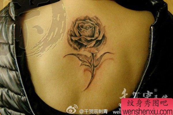 女生后背时尚精美的黑灰玫瑰花纹身图案