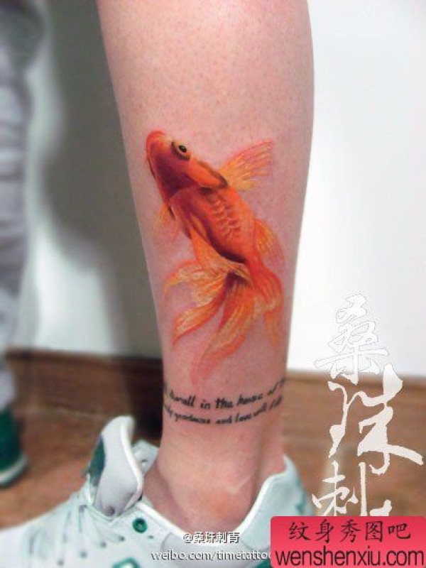 腿部漂亮好看的彩色小金鱼纹身图案