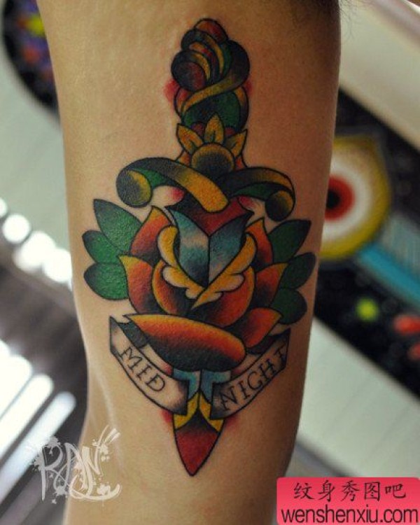 手臂漂亮的匕首与玫瑰花纹身图案