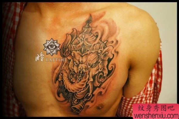 男士前胸帅气凶悍的象神纹身图案