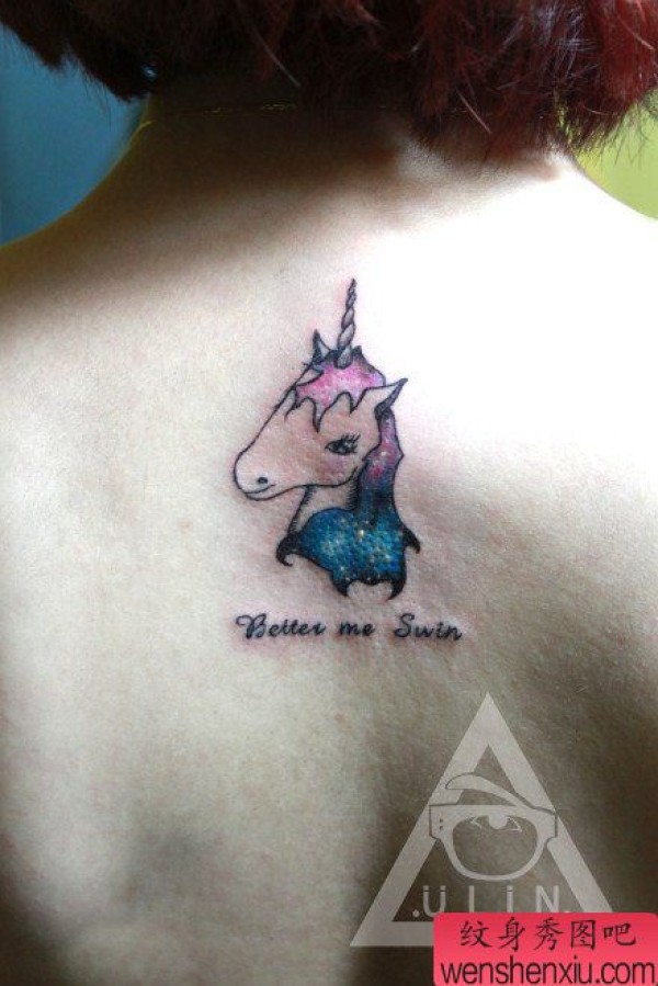 女生后背时尚小巧的星空与独角兽纹身图案