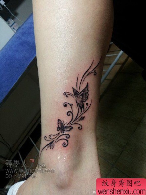女生腿部精美时尚的图腾蝴蝶藤蔓纹身图案