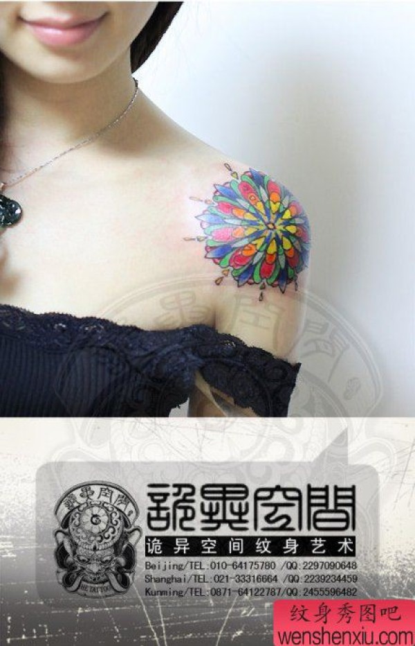美女肩膀处时尚漂亮花卉纹身图案