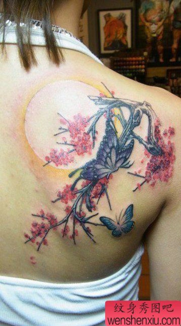 美女后背漂亮唯美的蝴蝶桃花纹身图案