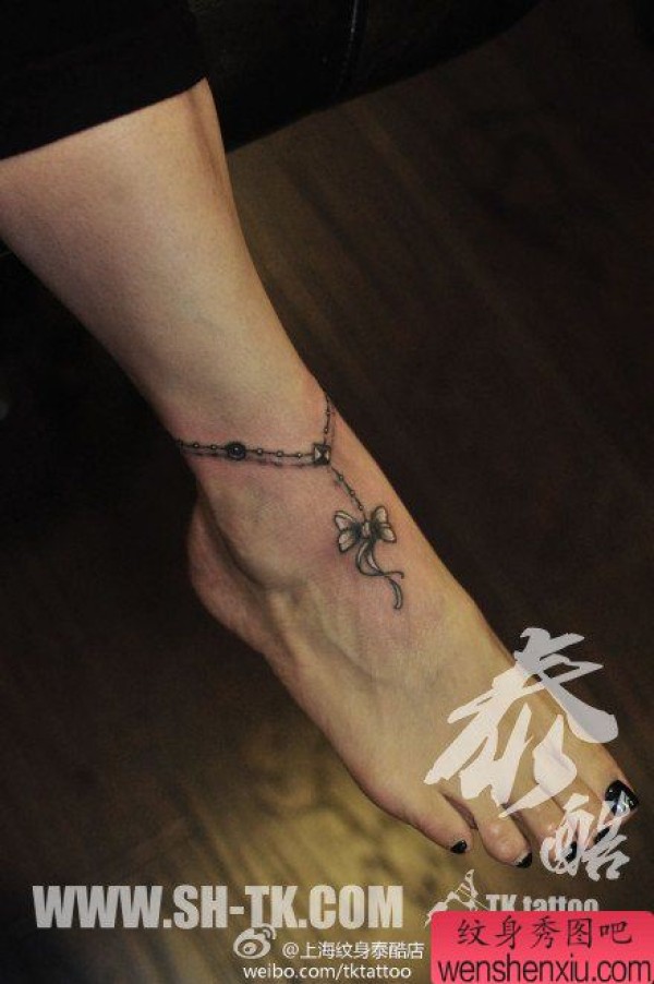 女生脚腕小巧时尚的蝴蝶结脚链纹身图案