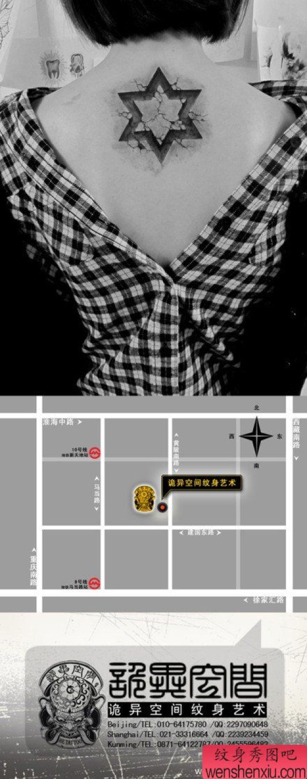 女生后背经典的石裂烙印六芒星纹身图案