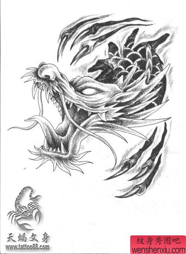 龙纹身手稿_一组老传统黑灰龙手稿纹身图案