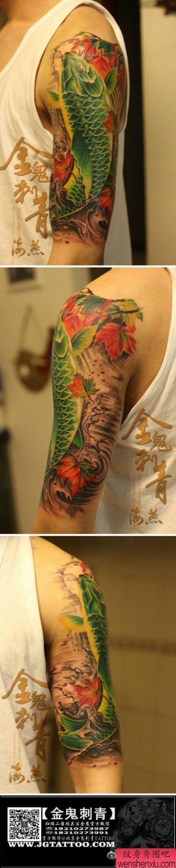 男士手臂漂亮写实的彩色鲤鱼纹身图案