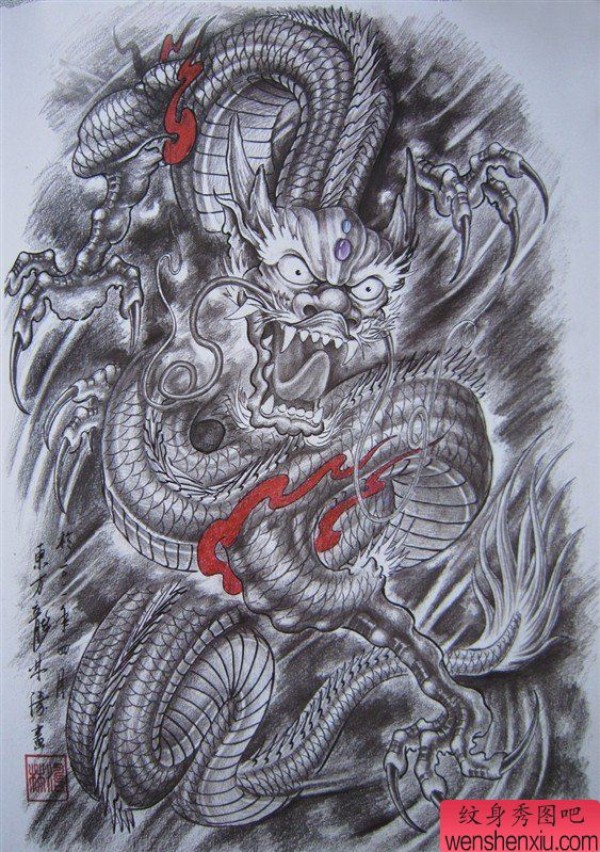 龙纹身手稿_一组老传统黑灰龙手稿纹身图案