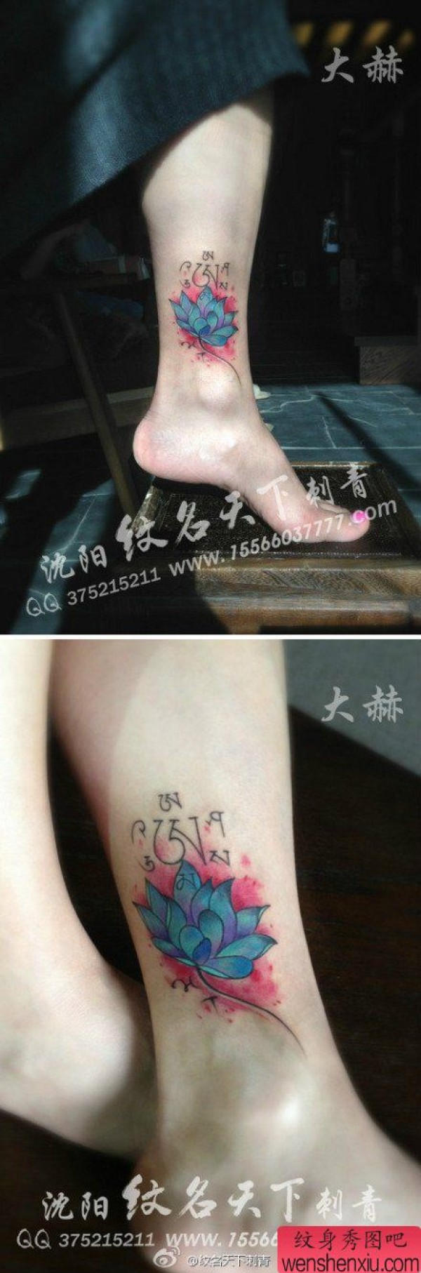 美女腿部时尚漂亮的彩色莲花纹身图案