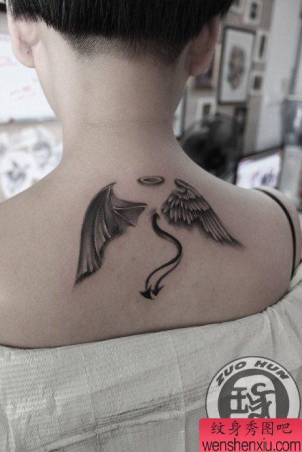 女生背部时尚的一半天使一般恶魔翅膀纹身图案