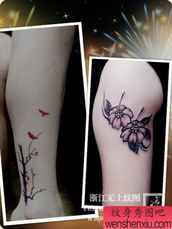 女生腿部可爱时尚的小树与小鸟纹身图案