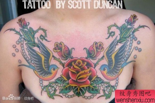 女生前胸时尚时尚的old school玫瑰花小燕子纹身图案