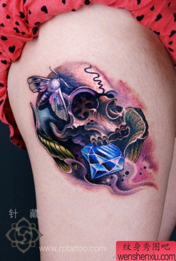 女生腿部超帅经典的骷髅与钻石纹身图案