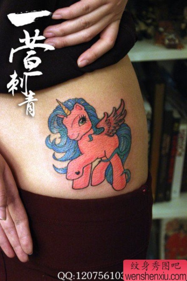 美女腰部时尚小巧的粉色独角兽纹身图案