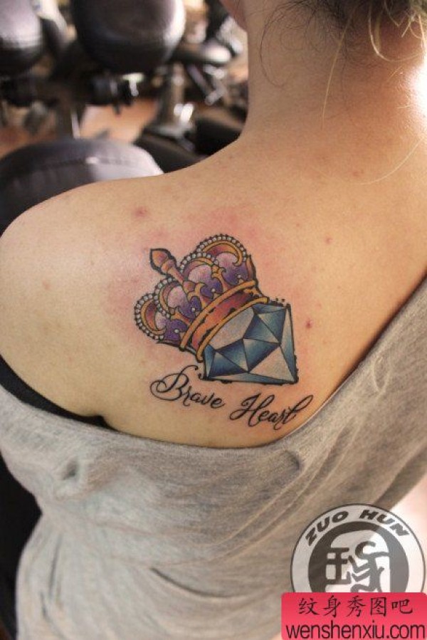 女生后肩背时尚漂亮的钻石皇冠纹身图案