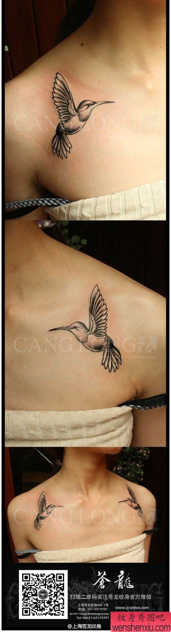 美女肩膀处小巧时尚的小蜂鸟纹身图案