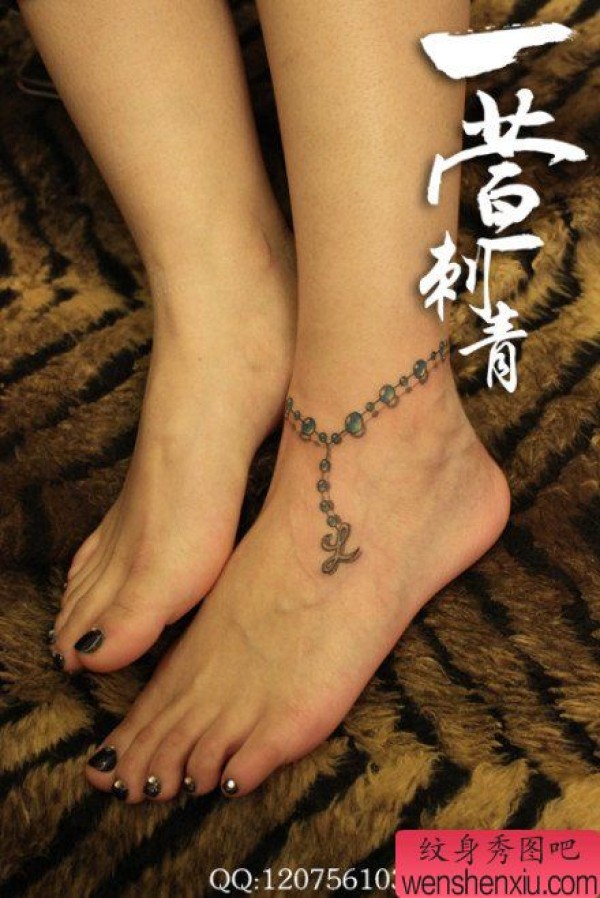 女生脚腕清晰精美的脚链纹身图案