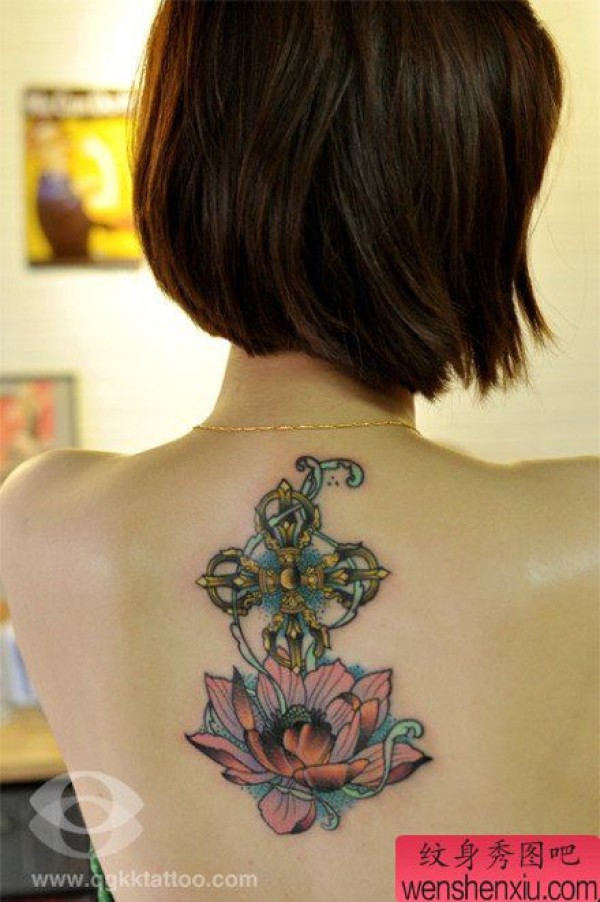 女生后背漂亮精美的莲花金刚杵纹身图案