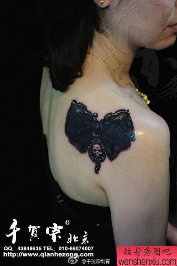 美女肩背时尚精美的蕾丝蝴蝶结纹身图案