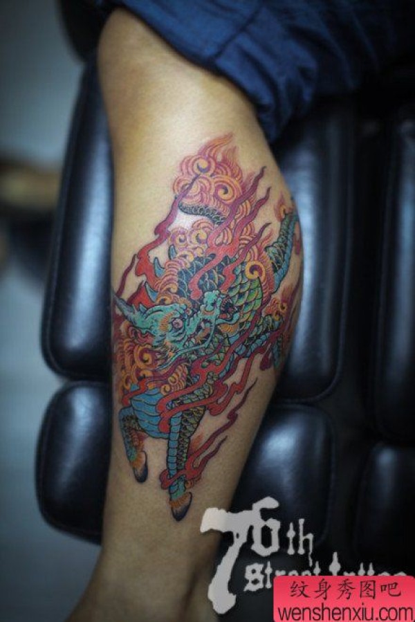腿部时尚超酷的麒麟纹身图案