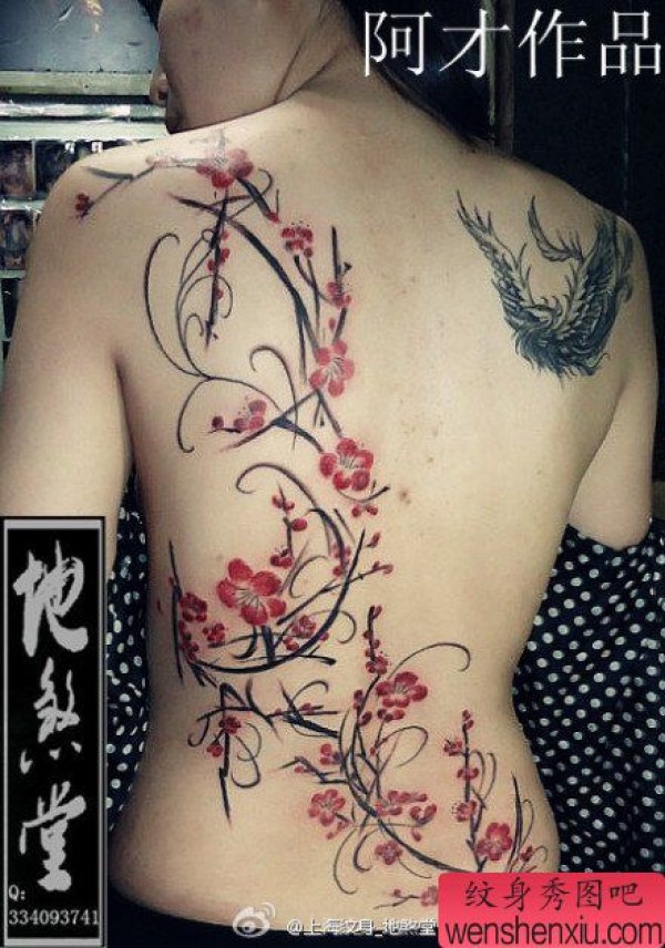 后背经典写意的梅花纹身图案