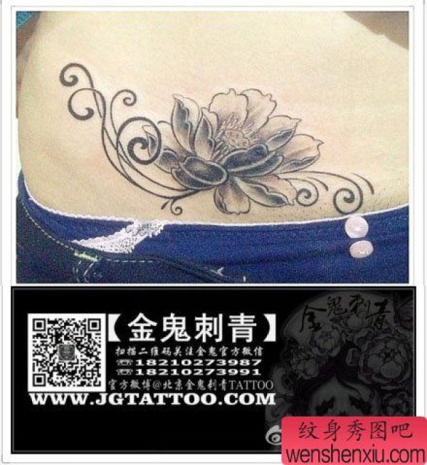 美女腹部唯美时尚的黑灰莲花纹身图案