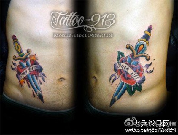 男生腹部帅气时尚的匕首玫瑰花纹身图案