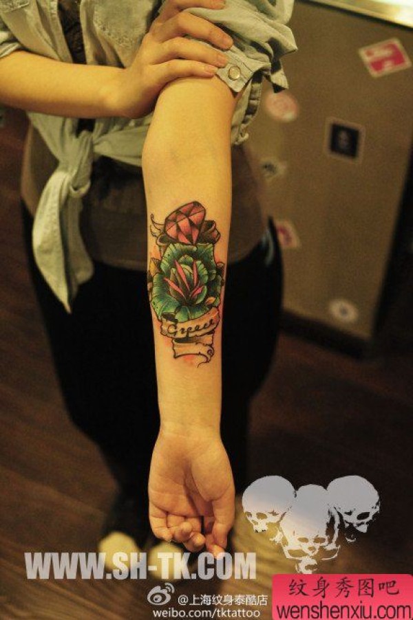 女生手臂漂亮时尚的玫瑰花与钻石纹身图案