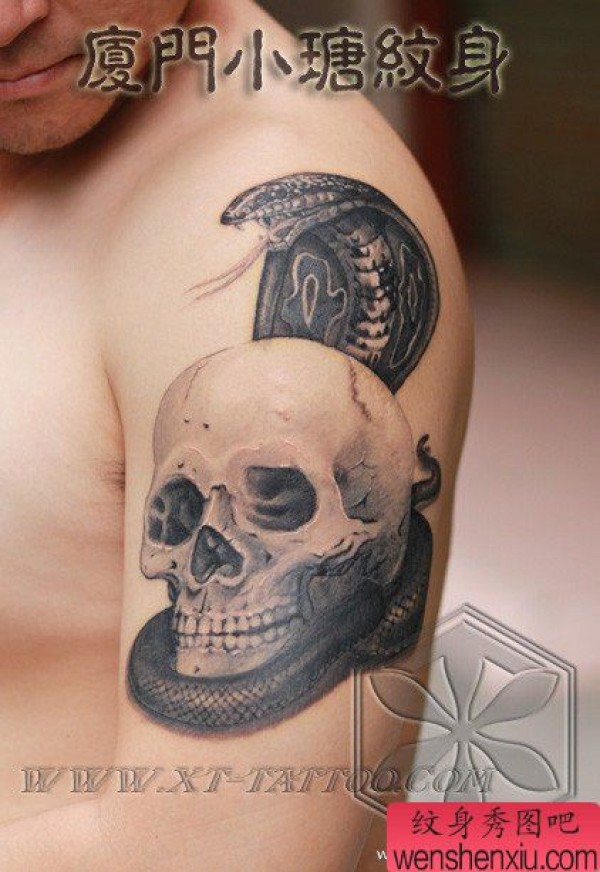 男士手臂帅气的眼镜蛇与骷髅纹身图案