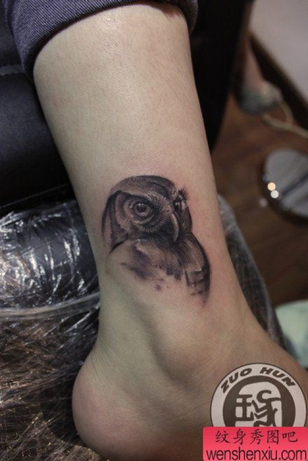 女生腿部时尚经典的黑灰猫头鹰纹身图案