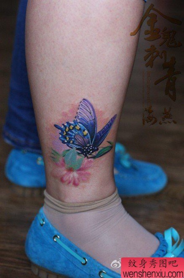 女生腿部漂亮超酷的彩色蝴蝶纹身图案
