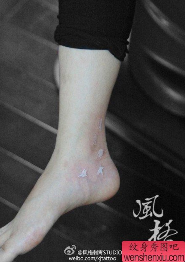 女生脚踝处小巧时尚的白色小鸟纹身图案