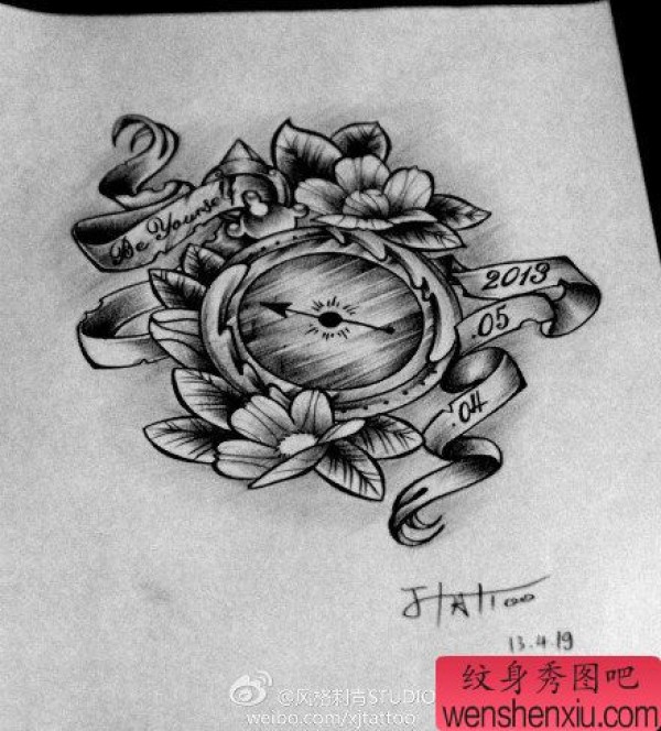一张漂亮时尚的黑灰指南针纹身图案