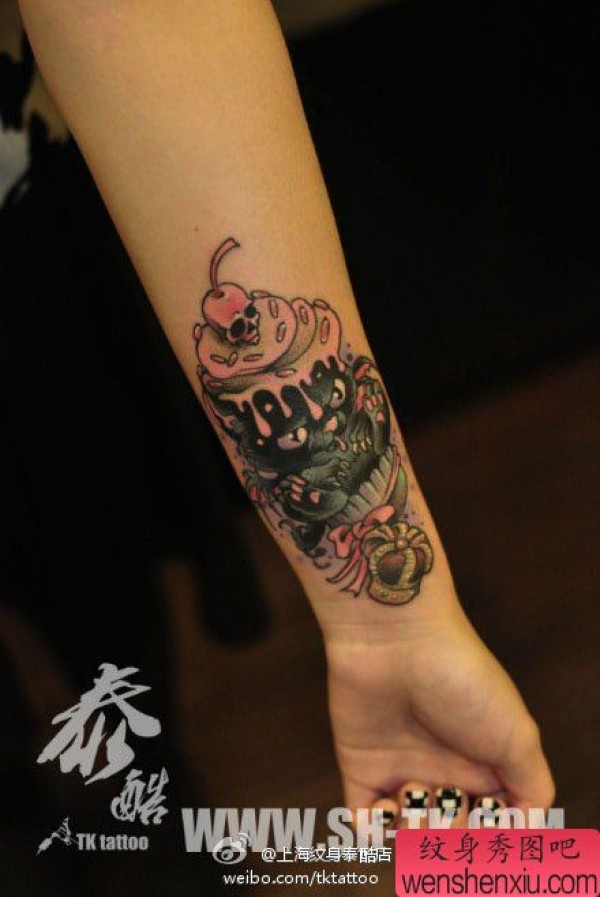 女生手臂可爱时尚的猫咪冰激凌纹身图案