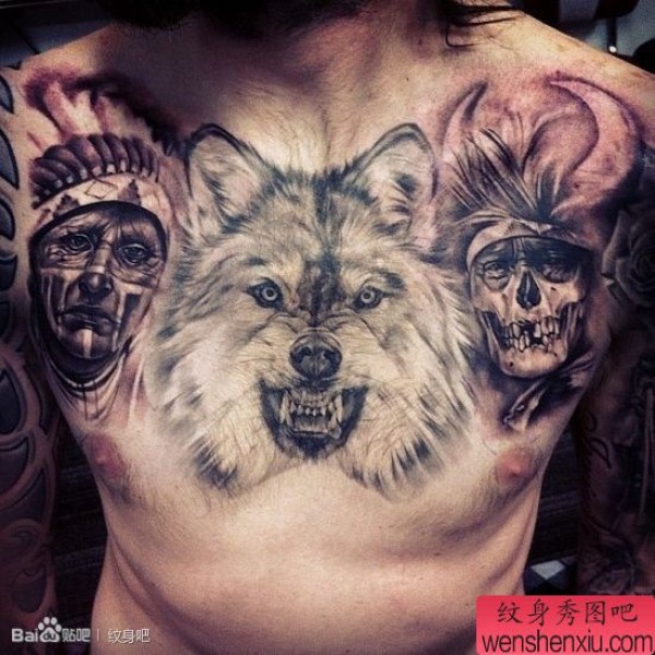 男士前胸霸气凶悍的黑白狼头纹身图案