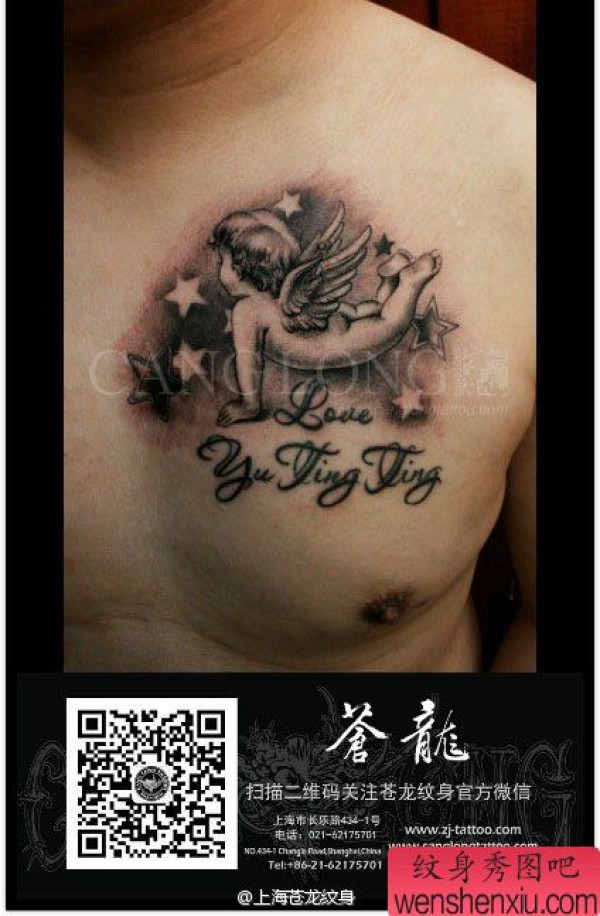 男士前胸经典时尚的小天使纹身图案