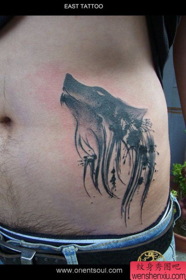 男士腹部帅气经典的水墨狼头纹身图案