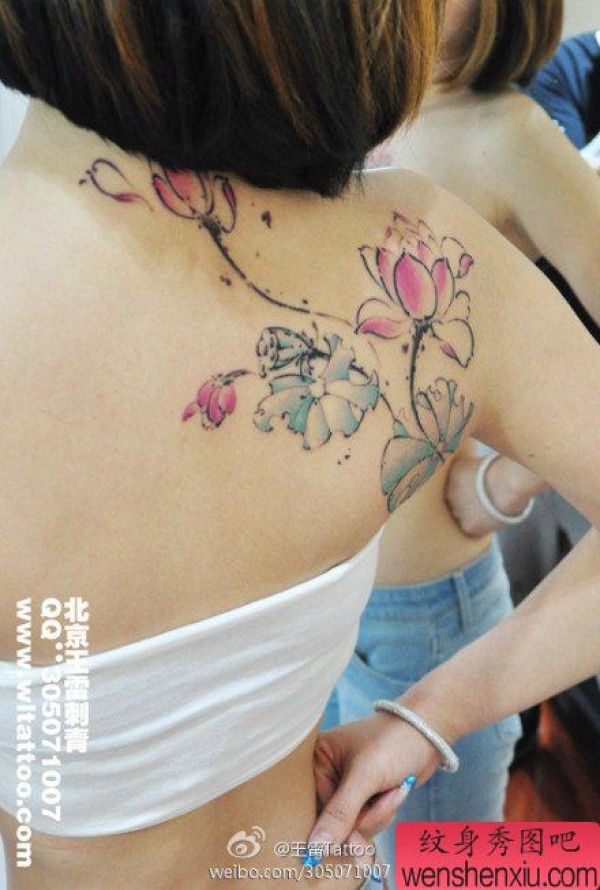 美女后背漂亮精美的彩色水墨莲花纹身图案