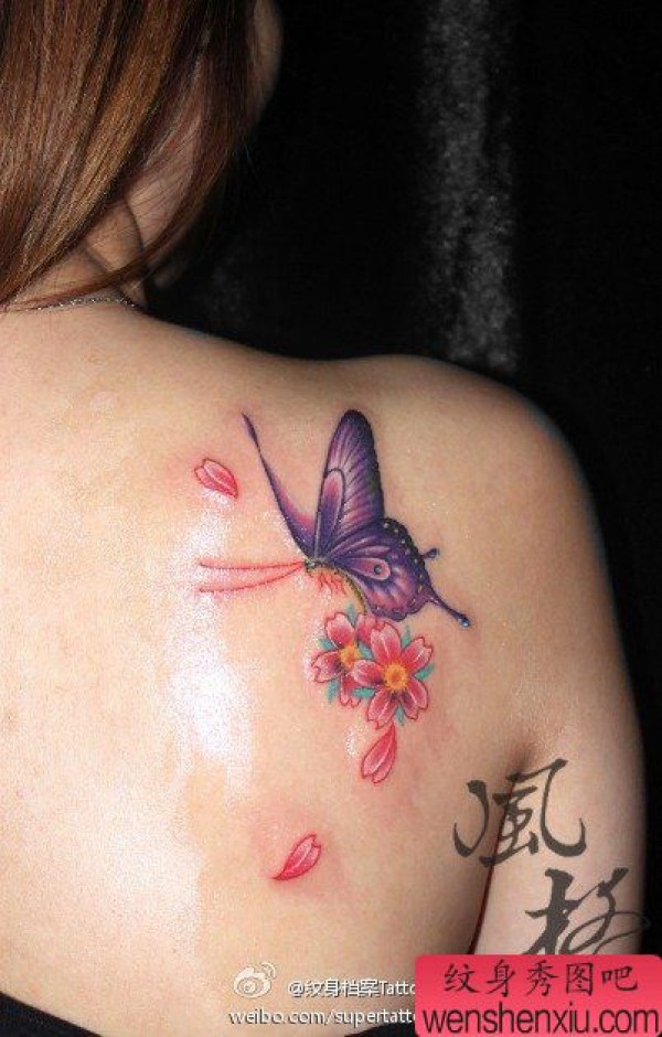 女生肩背时尚漂亮的蝴蝶樱花纹身图案