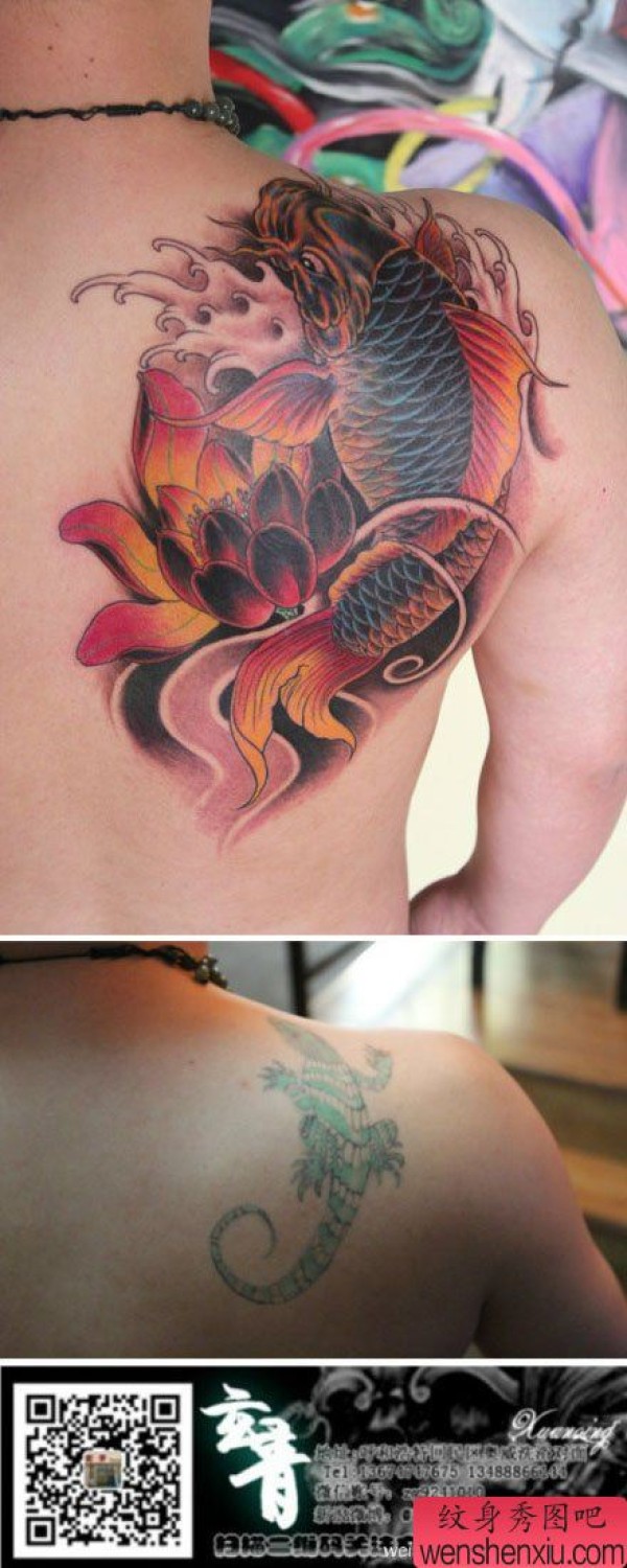 男生后肩背时尚时尚的鲤鱼莲花纹身图案