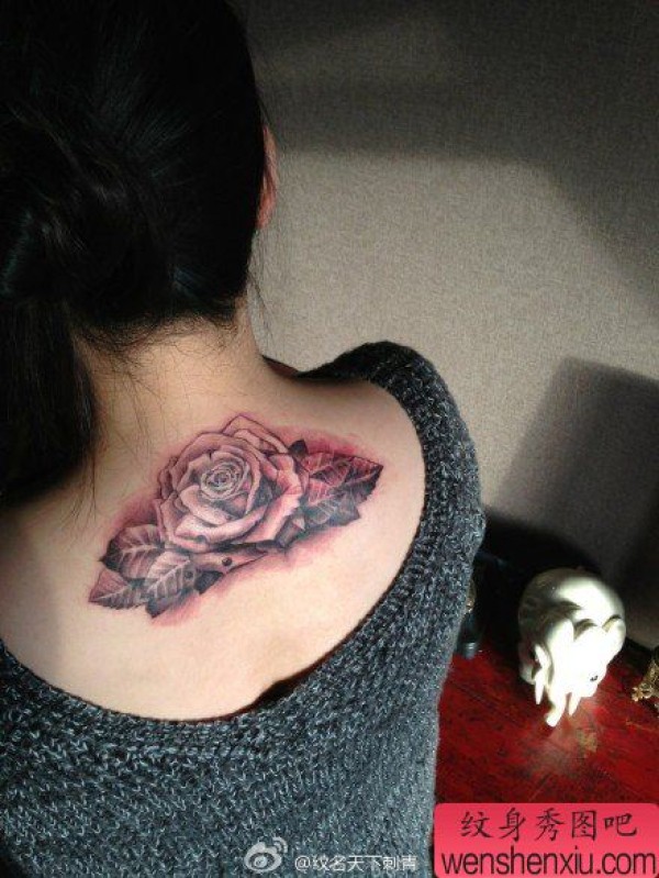 女生后肩背唯美时尚的黑灰玫瑰花纹身图案