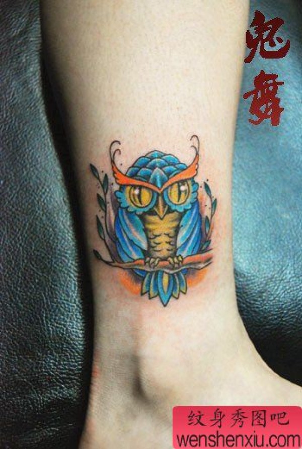 女生腿部时尚时尚的小猫头鹰纹身图案