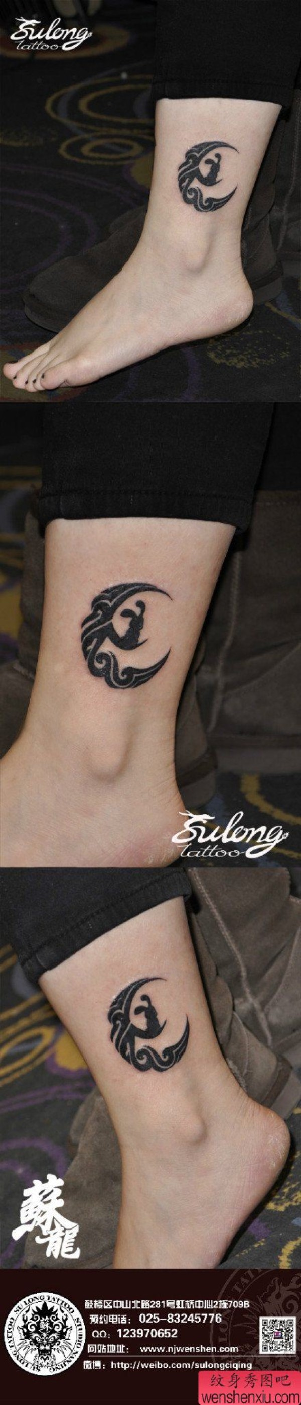 女生腿部时尚的图腾月亮与小兔子纹身图案