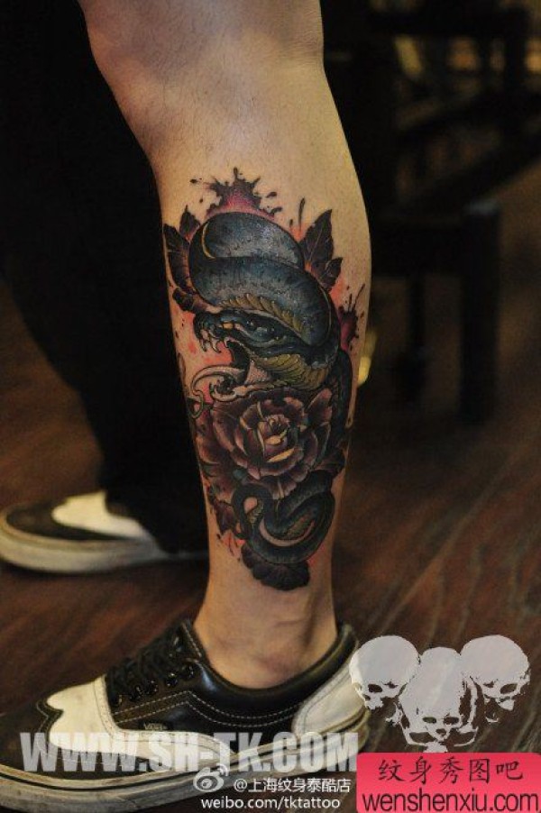 腿部霸气超酷的new school蛇与玫瑰花纹身图案