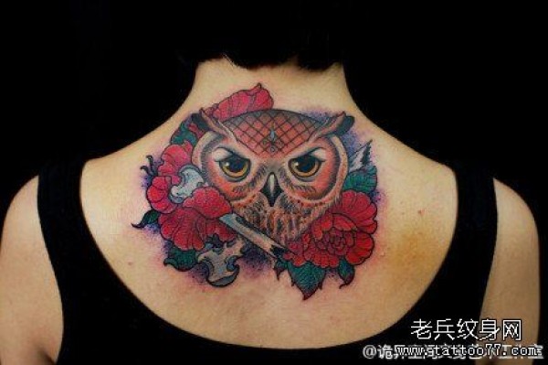 女生后背时尚经典的猫头鹰纹身图案
