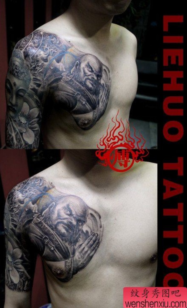 超帅经典的半胛达摩与佛头纹身图案